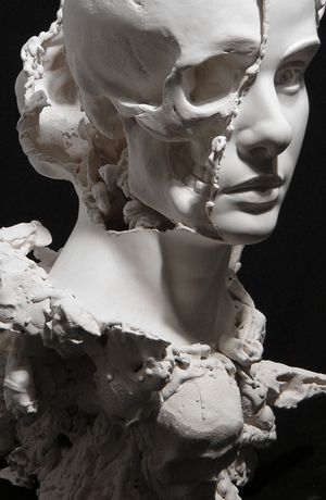 pristine portrayal of the possibly female sitter, whose face is partly carved away on the left to reveal the naked skull lying beneath the flesh.